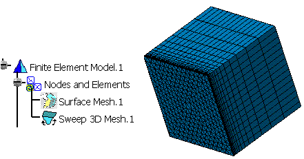 This use case shows you how to create sweep 3D mesh parts. The macro opens an Analysis document and creates Sweep 3D mesh. A surface mesh must exist and it may or may not be associated with geometry. If the surface mesh is associated with geometry, this geometry can be face or a set of connected faces. The sweep 3D mesh generates hexahedron elements and wedge elements from the surface mesh. In this macro the mesh is created on a surface mesh part. Values are assigned to the global specifications associated with this mesh part. This scenario requires "FEM Solid (FMD) product".