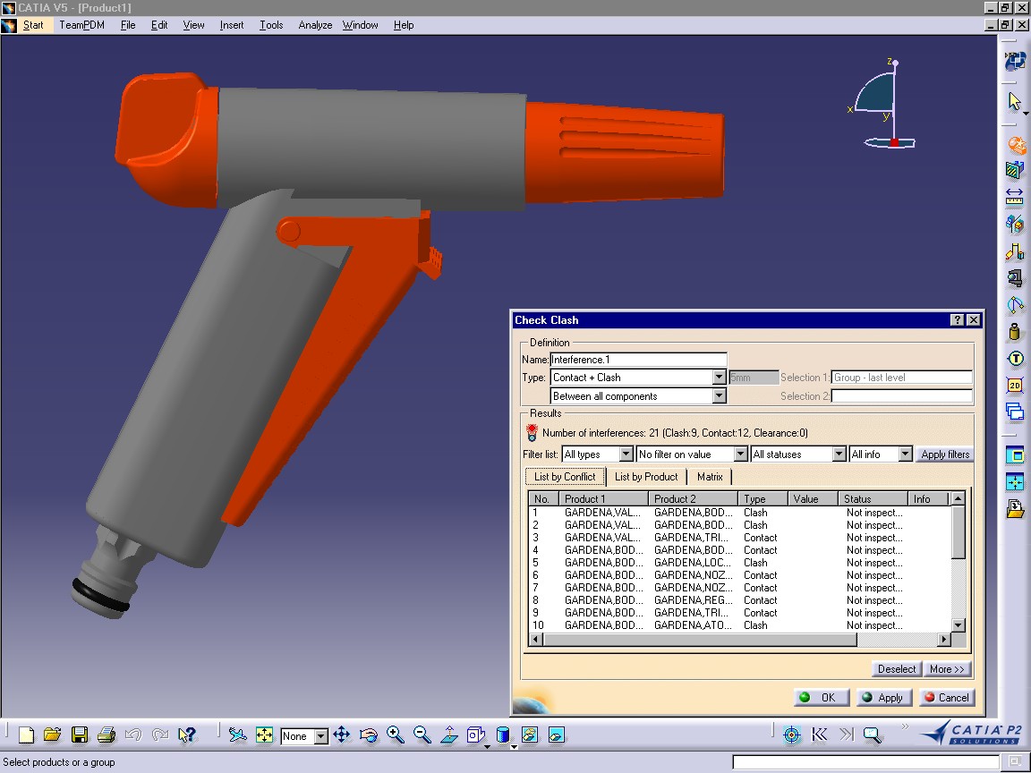 A clash reports all the interferences which occur in a complex assembly. Depending on its type (see CatClashComputationType), It may be computed between products or groups of products. Use the FirstGroup and SecondGroup properties to access those groups.