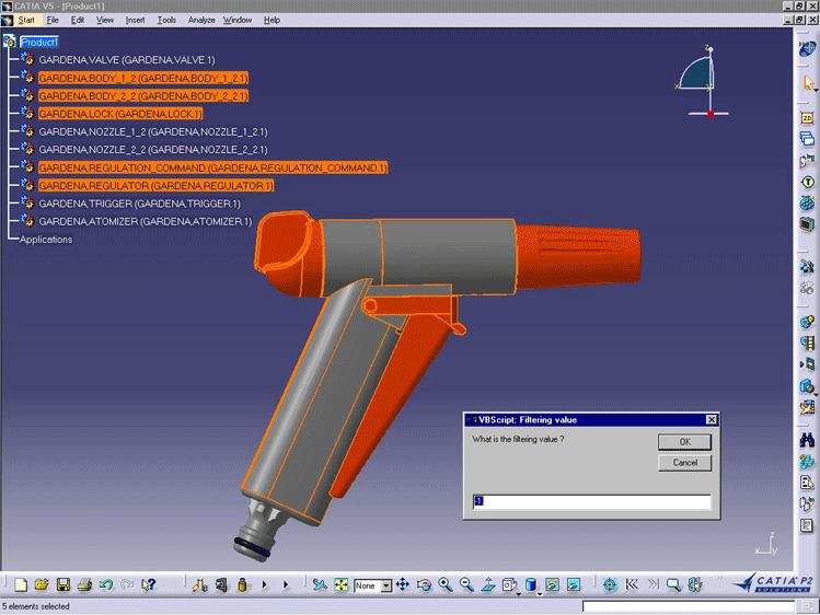This macro shows you how to use clashes to compute and filter an interference: all conflicts with a given type or with a penetration depth greater than a given value will be declared as irrelevant with a comment. The macro assumes that a CATProduct has been loaded and that some components are selected. This image shows the selection state before the use of the macro :