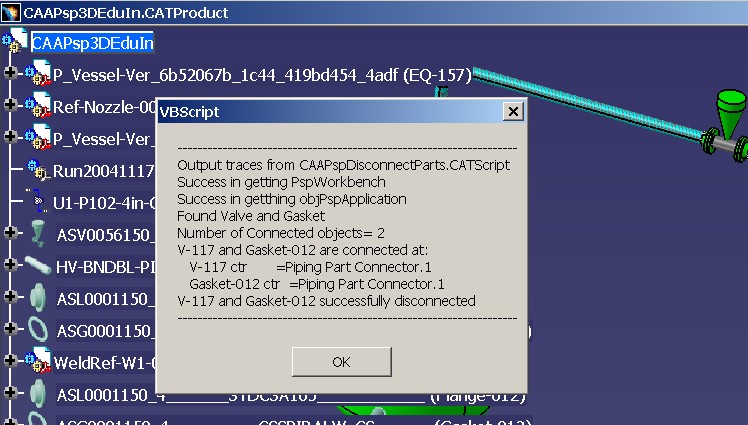 Disconnect Two PartsTo get corresponding connectors on the two objects, use the index of the Gasket-012 object in the list objLCntbles and obtain the corresponding PspConnector objects from List of connectors objLCntrsOnThisObj and objLCntrsOnConnected. Connector on the Valve is obtained as objPspCntrValve while on the gasket it is objPspCntrGasket. ...