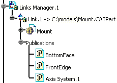 To use a publication as a support for a feature in Abaqus for CATIA V5, select the publication from the specification tree. Publications appear under the Links Manager objects set, as shown in Figure 8–4.