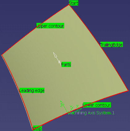| 4. | Select the leading and trailing edges to define the limits of the machining. The Edge Selection toolbar appears to help you select these edges. They must intersect the upper and lower contours. | |