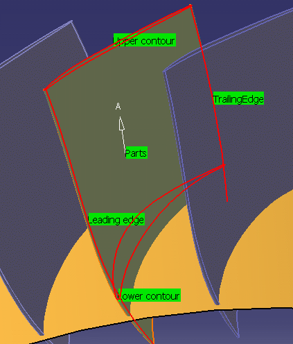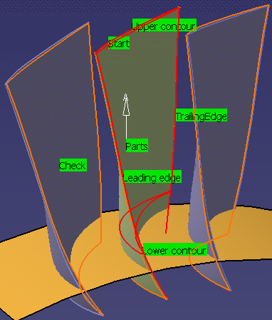 The part surface, upper and lower contours, and leading and trailing edges of the sensitive icon are colored red indicating that this geometry is required and must be selected. The upper and lower contours and the leading and trailing edges must lie on the faces selected as part surface. Selection of check elements (such as neighboring blades or fixtures) is optional. |