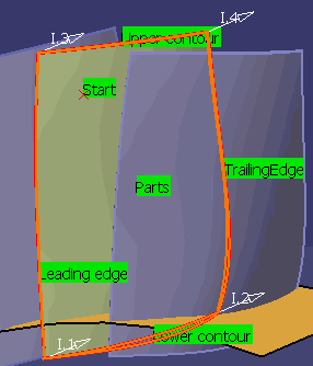 | 4. | Select the leading and trailing edges to define the limits of the machining. The Edge Selection toolbar appears to help you select these edges. They must intersect the upper and lower contours. | ||||||||||||||||||||||||||||||||||||||||