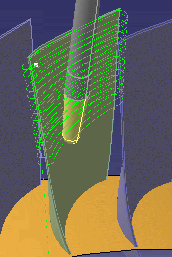 The following procedure explains how to produce a collision-free tool path when you use Multi-Axis Helix Machining in Interpolation mode. In this example, it describes an iterative process for machining a blisk blade while avoiding collisions with neighboring blades.
