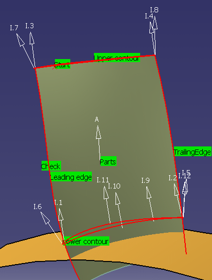 Replay the tool path to verify that the tool can be positioned at each point on the trajectory. If the tool cannot be positioned at each point on the trajectory, you may need to adjust the default axes and/or insert additional interpolation axes. You can insert any number additional axes on the faces of the blade.