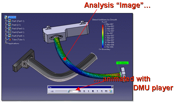 DMU Engineering Analysis Review in a NutshellDMU Engineering Analysis Review provides an easy to use capability to review the specifications and results of engineering analysis studies. With this tool, it is possible to read data created with structural analysis products: Generative Part Structural Analysis (GPS), Generative Assembly Structural Analysis (GAS), ELFINI Structural Analysis (EST), FEM Surface (FMS) or data created in by third party applications integrated through CAA. The DMU Engineering Analysis Review workbench is accessible only when these tools are not installed. In the context of the Digital Mock-Up (DMU), this product takes the integration of Design and Analysis to a new level with the ability to perform interference checking and measurements between the deformed shape of parts or products under in service loading and the surrounding parts and products. Thus ensuring that required packaging and clearances are validated for both nominal conditions and operational conditions. In addition, review can be in the form of contour plots or arrow plots, displays can be animated, and HTML reports of results can be created.