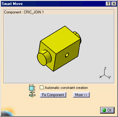 This functionality is an enhancement of the Insert Existing Component command for Assembly Design workbench. The Smart Move interface enables the easy positioning of inserted components in the assembly, at the very moment of their insertion. It also enables the positioning by creation of constraints. If there is no geometry to position when the component is inserted, this functionality has the same behavior as the Insert Existing Component command and visualization. See Smart Move or Smart Move with Viewer. |