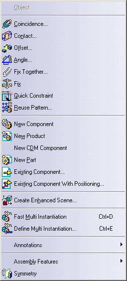 This section presents the Insert menu bar available when you run the application, only commands related to Assembly Design are presented: