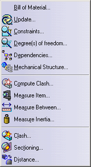 This section presents the Analyze menu bar available when you run the application, only commands related to Assembly Design are presented: