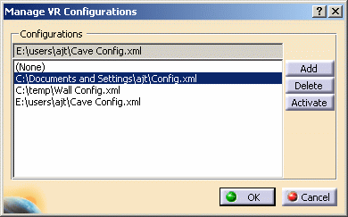 Version 5 session. Prior to activating a configuration, you need to generate the corresponding configuration file in the Immersive System Assistant workbench. Each configuration is saved in a .xml file and contains all the necessary MPK display configuration, including those related to the supported drivers and brokers which are now threaded. To set a configuration as active, click the Manage button to open the following dialog box: |