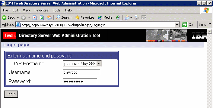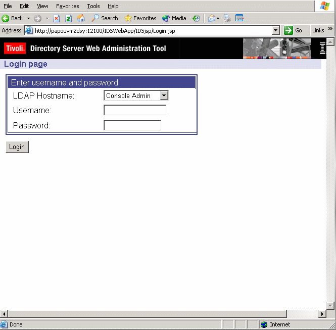 Then, refer to the section "Starting the Web Administration Tool" in the IBM Tivoli Directory Server Installation and Configuration Guide Version 6.0 which explains the rest of the steps needed to add your directory server to the console. Logging in as the directory server instance administratorOnce your server has been declared, on the IBM Tivoli Directory Server Web Administration Login Tool page: