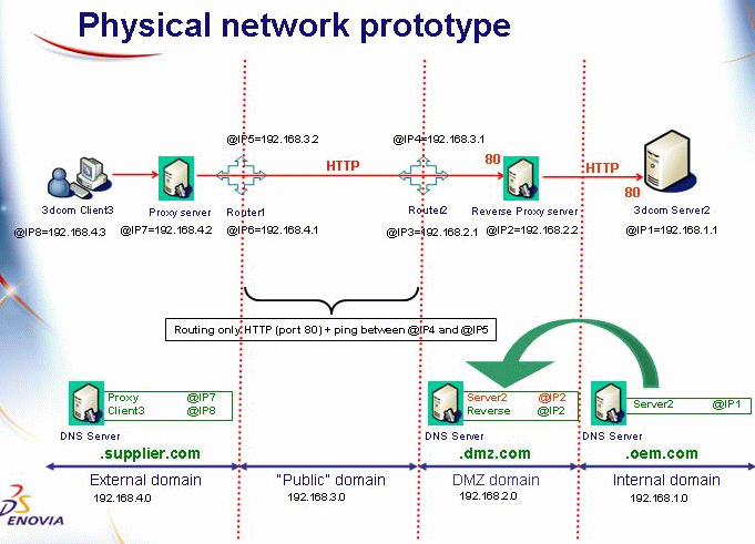 (We use private addresses 192.168.x.x for illustration purpose only. Of course they are irrelevant in the context of Internet.) FQDN of hosts pertaining to the oem public domain (e.g. www.dmz.com) can be resolved from anywhere in the network. On the contrary, FQDN of hosts pertaining to the oem internal network (e.g. eno3dcom001.oem.com) can only be resolved from the internal network itself and from the DMZ. To permit the client hosts to contact the 3dcom servers, the FQDN of the machine hosting the servers MUST be resolvable from the client network. Hence a record has to be added to the public DNS server of the oem company: oem public domain: