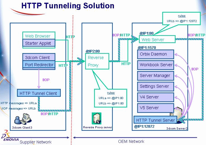 the HTTP Tunneling client process); The Web browser and the HTTP Tunneling client process are speaking to the Reverse Proxy server in HTTP. 3dcom HTTP and IIOP messages are redirected to the HTTP Tunneling client process that eventually handles: