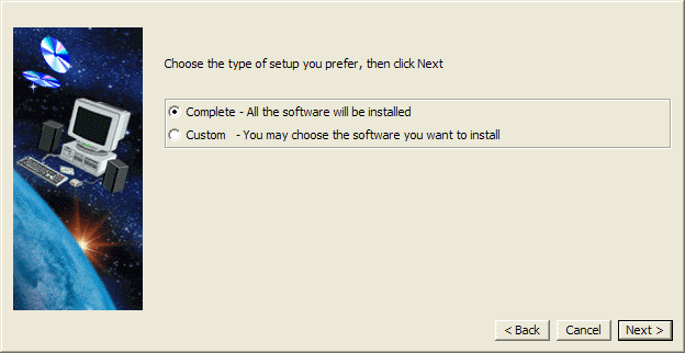 - Click Complete to install all the software, or Custom to