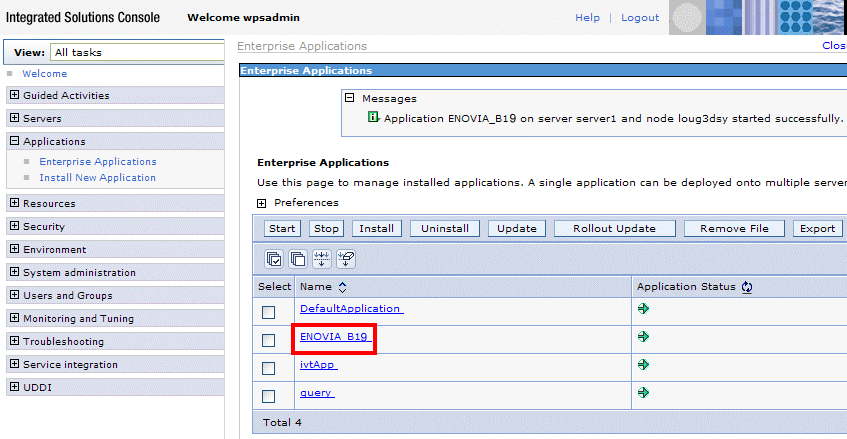 After you've installed the Enterprise Archive file, you need to check that the Web Application in the WebSphere Application Server has been launched. | ||||||||||||