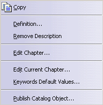 | Edit Current Chapter | Lets you modify the definition of the chapter or family to which the description belongs. See Modifying Catalog Entities. | |