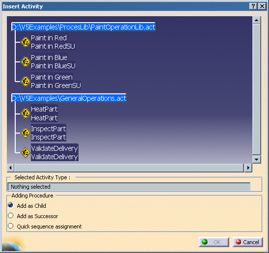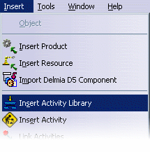 Adding Another LibraryAdditional libraries can be added and used by the current CATProcess document, independent of the libraries that were selected as the default in Tools> Options> Digital Process for Manufacturing> Libraries. This can be achieved by clicked Insert Activity Library