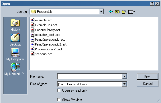 Selecting Add Process Library to Use invoke a File Open dialog which allows the user to navigate to the desired Process Library (.act) file: