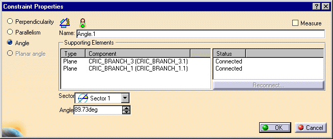 This task consists of setting an angle constraint between two planes. See Angle Constraints reference. | ||||||||||