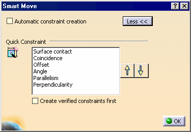 The Quick Constraint frame contains the list of the constraints that can be set. This list displays these constraints in a hierarchical order and can be edited by using both arrows to right of the dialog box. |