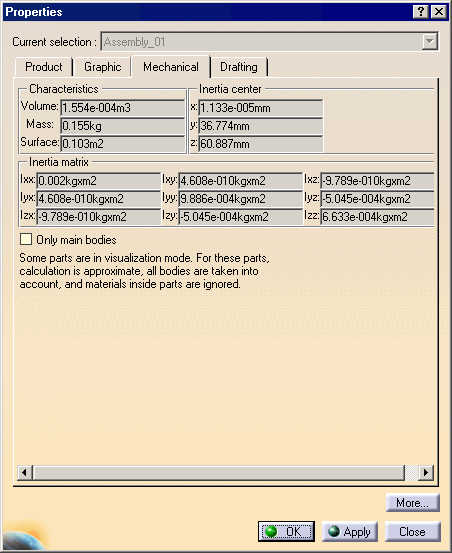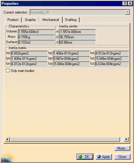 The Only main bodies option allows you to take into account only the main body of the related parts in the assembly, to determine the mechanical properties. If Only main bodies option is selected then it will remain activated until current CATIA session is on, and for a new session it will be cleared. |