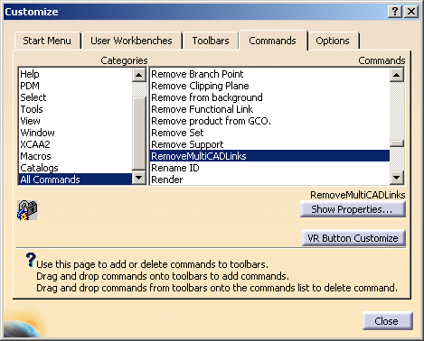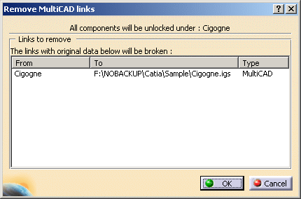 This procedure describes how to remove the MultiCAD links, i.e. to switch from the MultiCAD mode (where updates from original data are available and the data generated in V5 are in Read Only mode) to the Translator mode (where updates from original data are not available and the data generated in V5 are in Read/Write mode). |