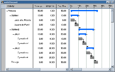 The left frame of the Gantt chart presents a table that lists the individual activities that are present