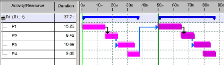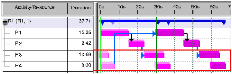 The illustration below shows an overlap. The cycle time was reduced to 30 seconds. The end-time for the processes P3 and P4 amount to 34.36 seconds and 37.71 seconds: