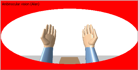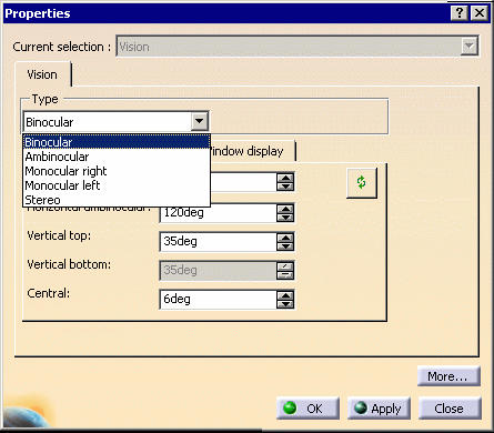 type selected. The five types of vision are: BinocularThe manikin's vision, like human vision, is made up of several different zones. One of these zones represents the vision of the two eyes. Each eye has a field of view shaped like an ellipse. Binocular vision can be interpreted as the zone defined by the intersection of the two shapes that define the right and left monocular visions. It represents the area you can see with both right and left eyes (clear zone).
