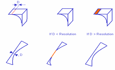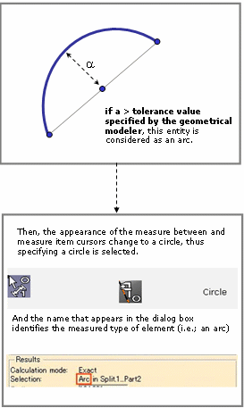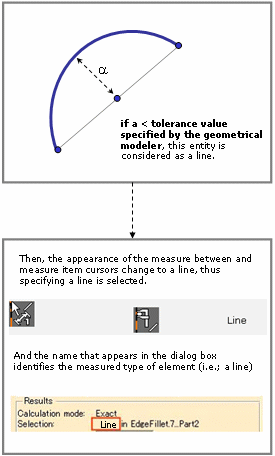 Impact of the Tolerance Value on Measure Between Computation in Exact ModeIt is not possible to guarantee the validity of measure results when those are below the tolerance value specified by the geometrical modeler (0.001mm). Impact of the Tolerance Value on Measure Item Computation in Exact ModeSurfaces, Arcs, curves and lines are created with respect to the tolerance value specified by the geometrical modeler. The Measure Item capability may detect that the geometry corresponds to an arc when the curvature radius is changing inside the limits of the tolerance value specified by the geometrical modeler.