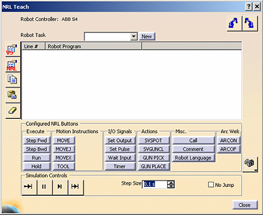 For ABB S4 (and other RAPID controller types), Native Robot Language (NRL) Teach displays controller-specific command buttons, and scripts corresponding statements.