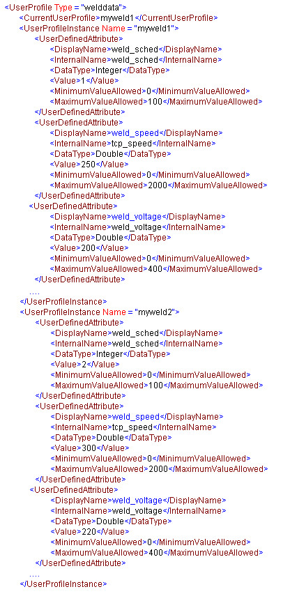 The Corresponding ABB RAPID welddata definition would be similar to this: PERS welddata 1,250.0,200.0,10.0,100.0,10.0,10.0; Similar process data definitions would be supported for ABB Rapid weavedata and seamdata datatypes. Welddata UserProfile Type Attributes:
