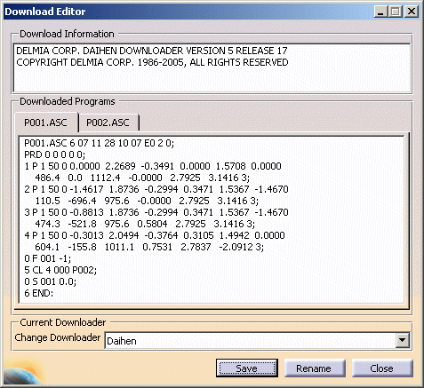Downloading generates a Daihen robot program file from