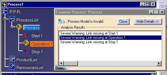 Any of the warning messages displayed in the list box can be selected in order to highlight the corresponding activity in the PPR tree, PERT viewer, or Gantt viewer, as shown in the following example: