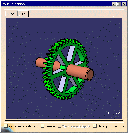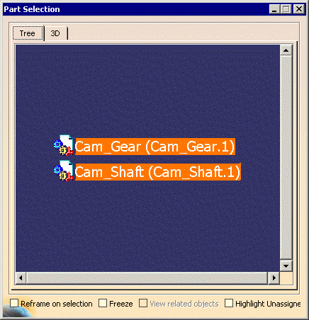 The Part Selection window will consist of a 3D tab and a Tree tab. Parts and resources may be selected from either and used for any other commands, such as assignment. |