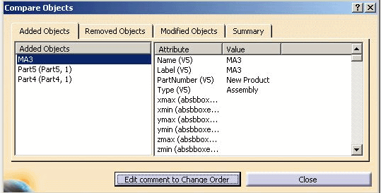 LimitationWhen comparing processes with one another, it is possible only to determine whether the assigned manufacturing assembly was created or deleted, or whether its attributes have been changed. The child objects of these manufacturing assemblies are not taken into consideration and are therefore not compared to one another. |