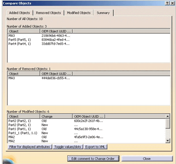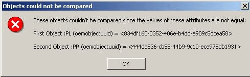 AlertThis message appears if you compare manufacturing assemblies whose comparison attributes do not correspond to one another. In this example, the comparison attribute oemobjectuuid does not correspond in either of the two projects. This attribute corresponds to the default setting, i.e. if you do not select any comparison attributes, this attribute is used automatically. For both of the comparison projects, i.e. the OEM project and supplier project, this means that the comparison objects were not derived from one another and therefore the manufacturing assemblies can not be compared. |