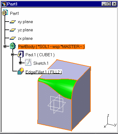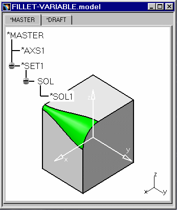 This task shows you how a variable radius fillet is migrated into CATIA V5 using the option CATIA_SPEC.