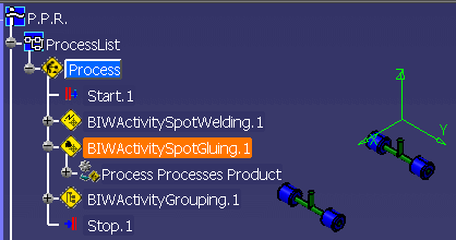 The images below are shown with the Show Activity's Products option selected in the Process Verification dialog box. When you first start Process Verification, no graphic is displayed. Start.1 is the current activity. By selecting the Next