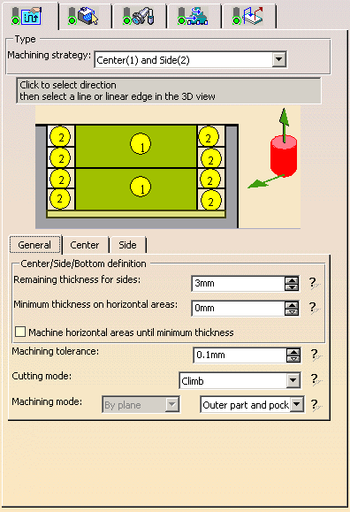 Center(1) and Side(2) Machining strategy on areas already partially