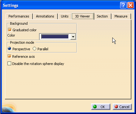 You can modify the 3D viewer settings by selecting the Settings button located in the horizontal toolbar. Upon clicking the button a dialog box will appear with the following options: