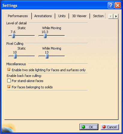 Note: Some of the performance settings (Pixel Culling and Level Of Detail) will enhance performances. Whereas, Back Face Culling will have an impact on the performances mainly because the faces that were not previously drawn (because they were not visible) will be systematically rendered. This decrease in the performance is totally dependent upon the model size. |