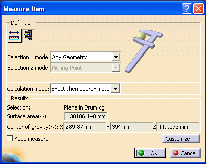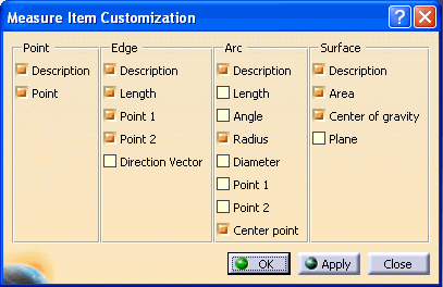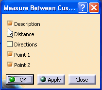 Measuring provides the ability to obtain approximate or exact measurement units of an object's geometric constitution. With this function, you can measure 3d type CATIA V5 files such as .CATPart, .CATProduct, .model, and .cgr. This function allows you to customize your results and display only what is required. |