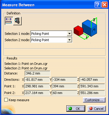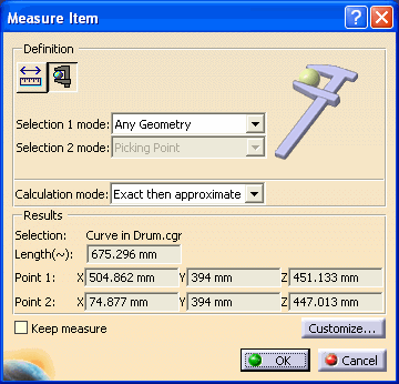 The ability to measure between two points is available with the Measure Between option. You can select two points on the viewer and the distance will be calculated. The results can be customized to your preferences. Items can be measured with the Measured Item option. The measurement result will be based upon the geometric type of the item. For example, a line will be measured in length. The results can also be customized to your preferences. This functionality will not work if you've displaced the products using the transformation command. |