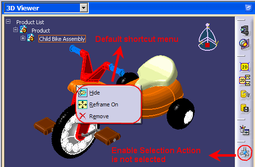 The Product List enables you to customize the view of product assemblies in the Web Viewer. It appears as either a free-floating dialog box or is immersed in the ViewerSpace (see Modifying Viewer Settings). You can use the Enable Selection Actions button in the viewer to see the Logical Subset of a Shortcut Menu (LSCM). By using LSCM, you will have the context of viewer properties and will be able to perform functions available in the toolbar, and the shortcut menu of the Favorite or Search windows. Un-select the Enable Selection Actions button when you do not