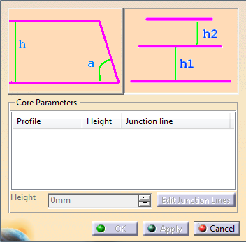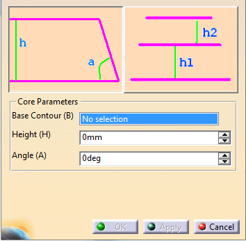 surface of the plies group where the variable core is created. The core can be defined either by the base contour, a height and an angle, or several contours and heights. Cores with complex contours, i.e. with a different number of