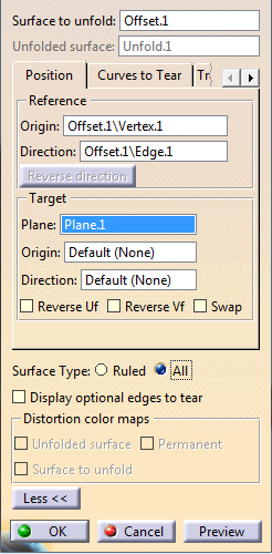 Unfold Definition dialog box when done. The Unfold.1 surface is created: If an unfolded surface has already been created for the support surface of