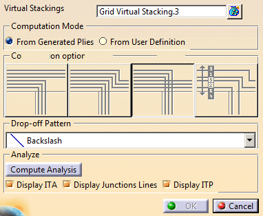 This task shows you how to generate a top surface from virtual stackings in one shot: From the virtual grid design, Top Surface from Virtual Stacking analyzes the plies to generate, identifies iso-thickness areas, automatically creates junction lines and provides a top surface. You must have created virtual stackings. |