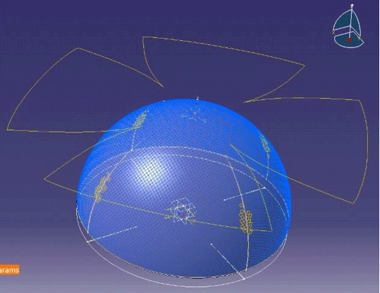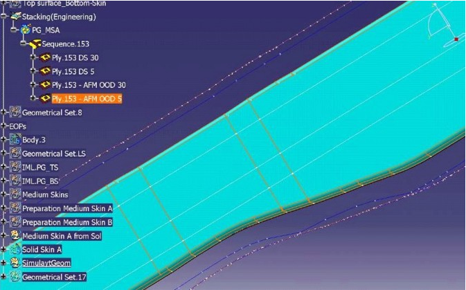 Display ModesThe 3D draped pattern for Composites Fiber Modeling is displayed in the same way as the standard fiber simulation. This means that the result can be used for inspection and 2D-3D transfer, and can be stored as curves in the V5 part. Note that the graphics visualization provided by CATIA does NOT reflect the underlying simulation completely in the following respects: